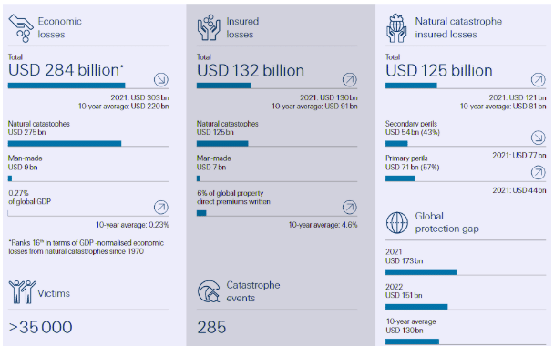 In recent years, losses from insured natural disasters have remained high, driven by increased hazard activity and a greater concentration of exposure in vulnerable areas. Recent reports from Munich Re and Swiss Re indicate that global annual economic losses from natural catastrophes average between USD 250 billion and USD 300 billion. Typically, insured losses make up USD 100 billion to USD 150 billion of that total. These statistics highlight a consistent trend of significant loss activity, even in years without major peak events like large hurricanes in the U.S. or earthquakes in Japan.