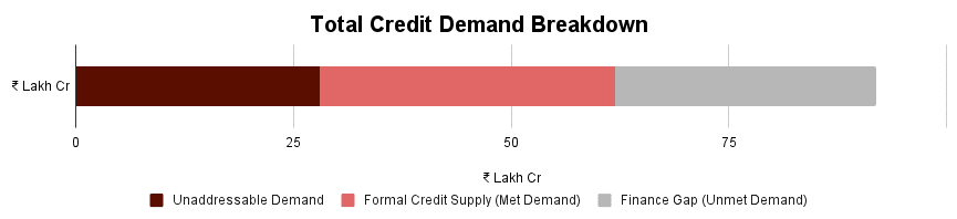 Independent studies (by IFC-Intellecap, SIDBI-TransUnion CIBIL, and SIDBI-Crisil 2025) estimate the total debt demand of Indian MSMEs at ₹90-95 lakh crore, with a massive finance gap of ₹25-30 lakh crore (22-25% of total requirement). These studies did not account for microenterprises whose operations are not deemed to be financially viable for institutional credit and are forced to rely on much costlier and riskier non-institutional credit – limiting their scale of operations, even potentially threatening their existence in many cases. For the remaining manufacturing SMEs alone, the unmet need is close to 20% of their total demand and rises to 30-35% for micro-manufacturing units in textiles, metals, and garments. In the manufacturing sector, SIDBI reports, “While access to finance has improved for some, concerns about adequacy and availability persist for a significant portion of manufacturers.”