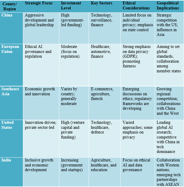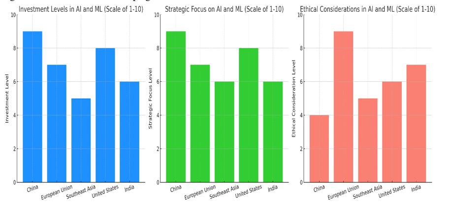 Each of the various countries adopted a method according to its policy, technological, and economic scenarios. For example, ethical governance and legislation for proper deployment of AI assume an important place in the European Union, but China is spending much on AI to help the country top the rankings in the world by the year 2030. Many Southeast Asian nations are implementing AI to enhance economic growth by focusing on applications that solve regional problems and strengthen their competitive advantage. Understanding the varied approaches nations are taking, their strategic priorities, and the ethical implications of new technologies becomes ever more critical as they spread. The following graphs are a comparison of the strategic priorities, investment levels, and ethical issues regarding AI and ML in various geographical areas.