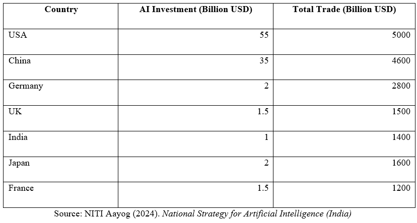 To assess the economic impact of Artificial Intelligence (AI) and Machine Learning (ML) adoption, this study employs regression analysis to investigate the correlation between AI-related investments and international trade activity. The objective is to determine whether nations investing heavily in AI experience greater trade engagement. The analysis draws on data from seven influential economies, namely, the United States, China, Germany, the United Kingdom, India, Japan, and France, focusing on their respective AI investment levels and total trade volumes, defined as the aggregate of imports and exports. These countries were chosen due to their technological prominence and active participation in global commerce, making them ideal for examining how digital innovation intersects with cross-border economic flows.