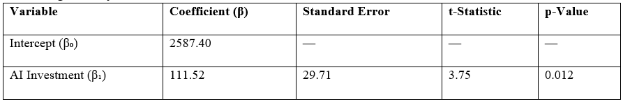 The coefficient of 111.52 implies that for every additional billion USD invested in AI, a country’s total trade volume increases by approximately 111.52 billion USD, on average. The relationship is statistically significant (p = 0.012), and the R-squared value of 0.74 indicates that 74% of the variation in trade volume across the countries in the sample can be explained by differences in AI investment. These findings provide preliminary empirical evidence supporting the notion that strategic investment in AI technologies may enhance a country’s trade competitiveness and global economic integration.