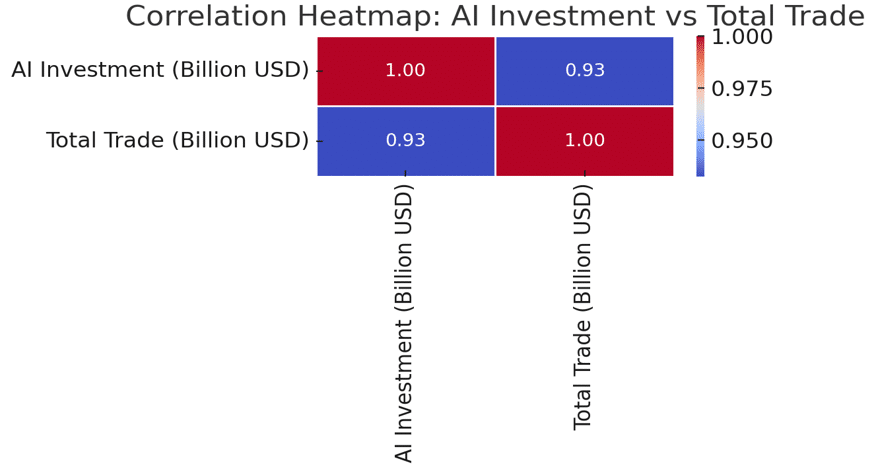 The heatmap revealed a strong positive correlation (r ≈ 0.97) between AI investment and total trade. This indicates that countries with higher AI investment tend to have greater trade volumes. For example, the United States and China, which are global leaders in AI investment, also reported the highest trade volumes. This pattern suggests a potential link between advancements in AI and a country’s trade competitiveness.